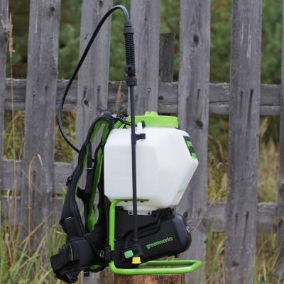 Опрыскиватель аккумуляторный 15 л. GREENWORKS G24BPSII (5300307UA) [24В, 1х2.0 Ач, з/у] — отличное решение для садоводов и владельцев больших огородов. Используется для борьбы с сорняками, вредителями, болезнями растений (распыление химикатов), распыления удобрений, полива растений. Может применяться для нанесения моющего средства на окна и другие поверхности, дезинфекции.